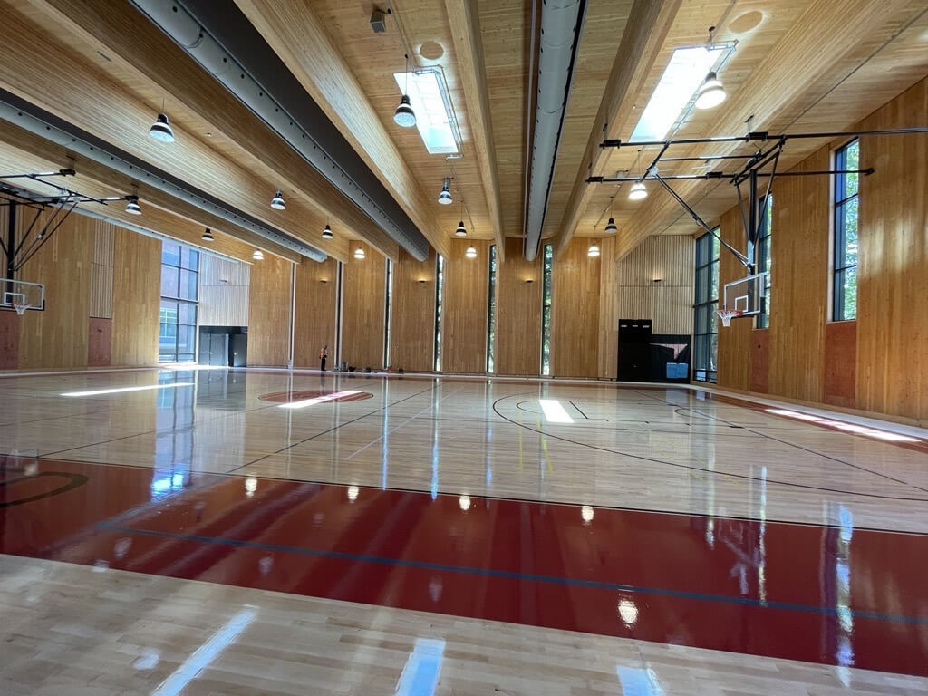 Built in 1965, the Watzek Sports Center suffered a structural failure during a 2021 winter storm, resulting in a roof collapse that underscored the need for significant campus improvements. In response, the 53,000-square-foot gymnasium underwent a comprehensive mass timber renovation and expansion to create a more welcoming and accessible community hub for Reed College. The renovation updated locker rooms, offices, the original entrance, and common areas. At the same time, the new addition featured a two-story basketball gym, fitness rooms, all-user restrooms, and a secondary accessible entrance.